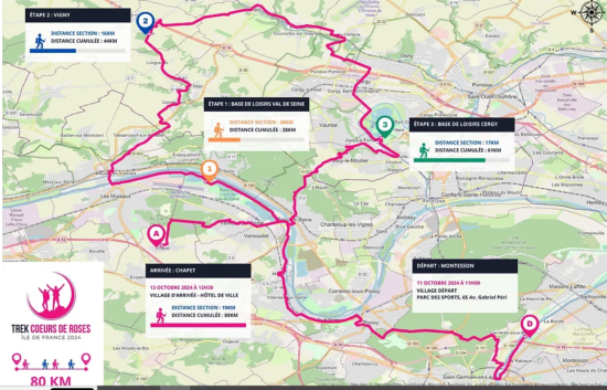 Une « boucle en forme de ruban rose » de 80 km avec la première nuit dans l’île de loisirs du Val de Seine à Verneuil-sur-Seine et la seconde étape sur la base de loisirs de Cergy.