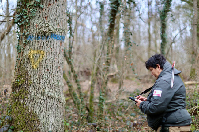 « Là, quand on voit en bord de chemin, un arbre avec un chevron bleu numéroté, ça signifie que c’est l’entrée d’un cloisonnement. Et quand on avance dans le boisement on trouve des traits bleus horizontaux et verticaux. Les traits horizontaux correspondent à l’emprise du cloisonnement, du passage. Ces arbres-là ont vocation à rester. Ceux qui ont un trait vertical sont ceux qui doivent être martelés et enregistrés pour la coupe de bois car ils sont au milieu du passage. Tous les 24 mètres on va créer une ouverture dans la forêt pour la circulation des engins forestiers. »