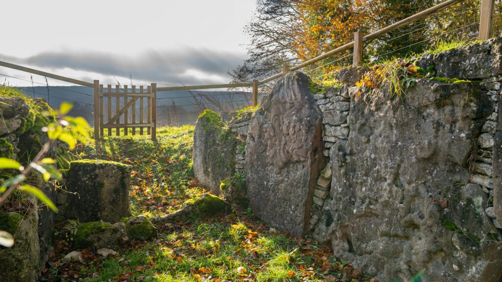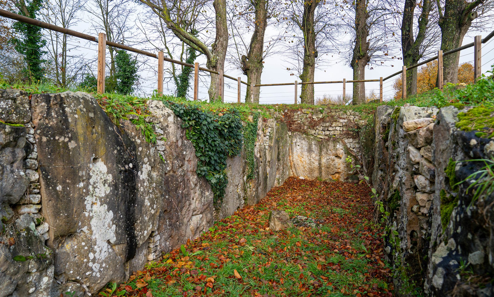 Âgée de près de 2200 ans avant notre ère, cette vieille dame de pierre, du grès, fut découverte en 1768. Fouillée une première fois en 1870, cette tombe collective se présente sous la forme d’une allée mégalithique semi-enterrée, plantée à flanc de coteau. De grandes dalles verticales appelées orthostates, soutenues par des murets de pierres sèches constituent ce site archéologique. Couverte complètement à l’origine, la chambre funéraire et la dalle d’entrée, percée d’un trou sont les seules à subsister.