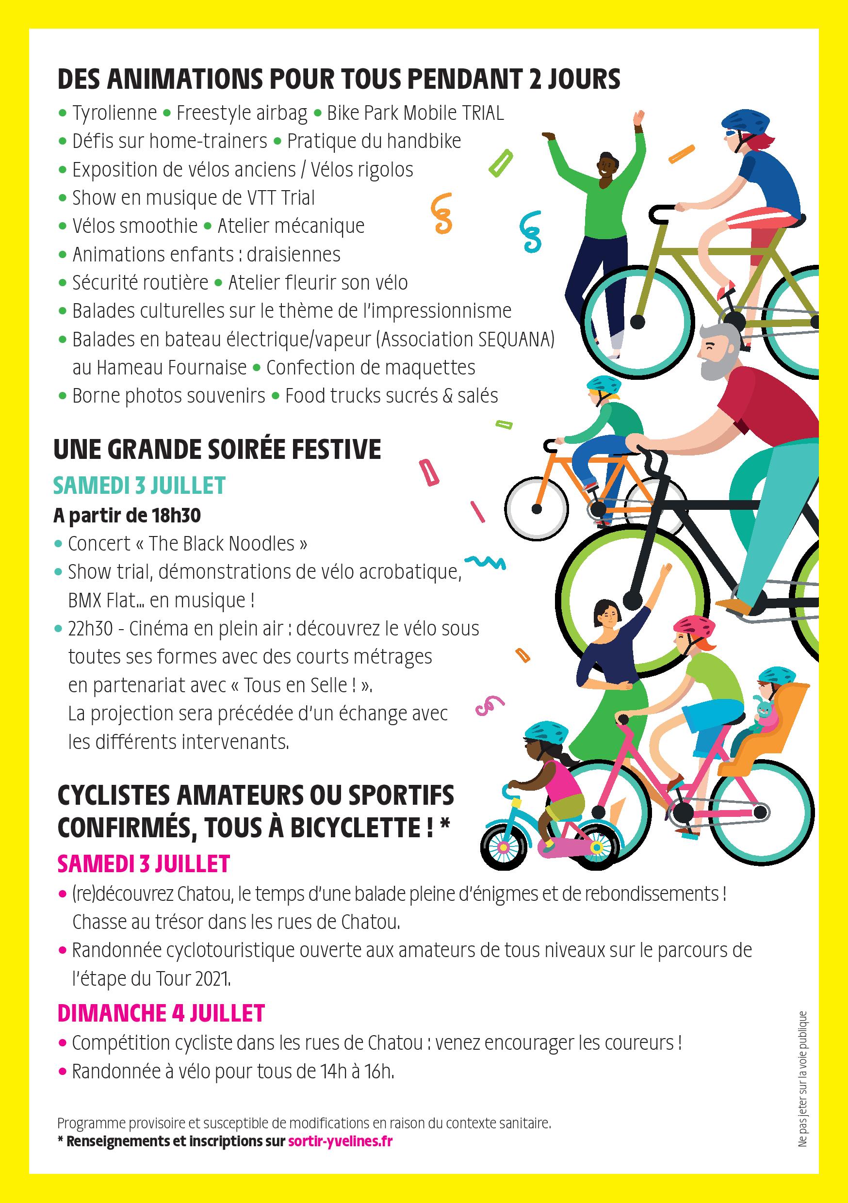 Pour célébrer la dernière étape du Tour de France 2021, le Département des Yvelines et la ville de Chatou organisent la Fête du Tour les 3 et 4 juillet 2021. 2 jours d’animations, de démonstrations spectaculaires et de fête !