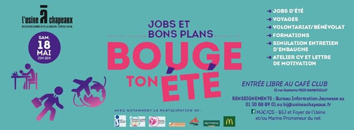 La MJC l’Usine à Chapeaux de Rambouillet organise, samedi 18 mai 2019, le forum Bouge ton été, réservé aux jeunes de 16 à 25 ans. Au programme, jobs d’été, séjours en France ou à l’étranger et ateliers de recherche d’emploi.
