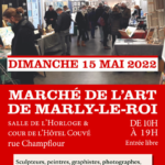 Dimanche 15 mai, de 10h à 19h, marché de l’art à la salle de l’Horloge et dans la cour de l’hôtel Couvé (rue Champflour) organisé par l’association “Salade d’artistes à la Marlychoise”. Venez découvrir les œuvres de 30 artistes de Marly et des environs (peintres, sculpteurs, céramistes, photographes …).
