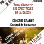 Nous vous accueillerons avec plaisir le vendredi 15 septembre à 20h à la présentation de saison. Ce sera l’occasion de découvrir des spectacles, de discuter avec l’équipe du théâtre et artistes. Un concert des Eléphant Gun , groupe Folk/rock accompagnera cette présentation. La soirée se terminera par un cocktail de bienvenue! Nous vous attendons nombreux.