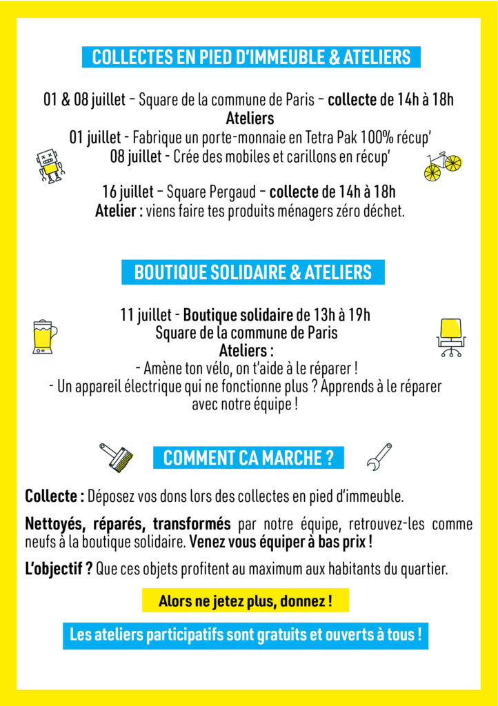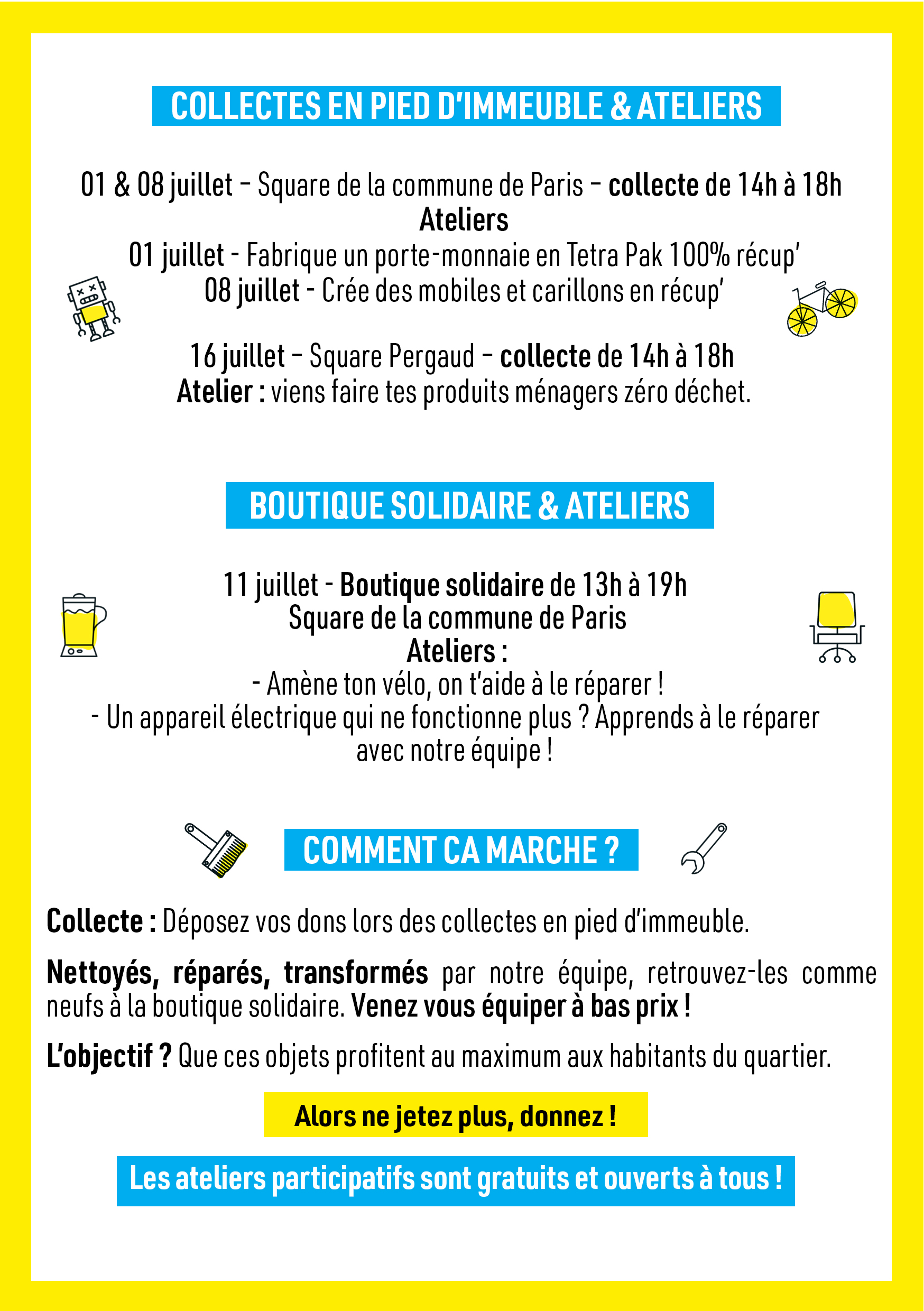 Vêtements, meubles (sauf matelas), appareils électriques, livres, bibelots,… Même usées, à réparer ou en panne !