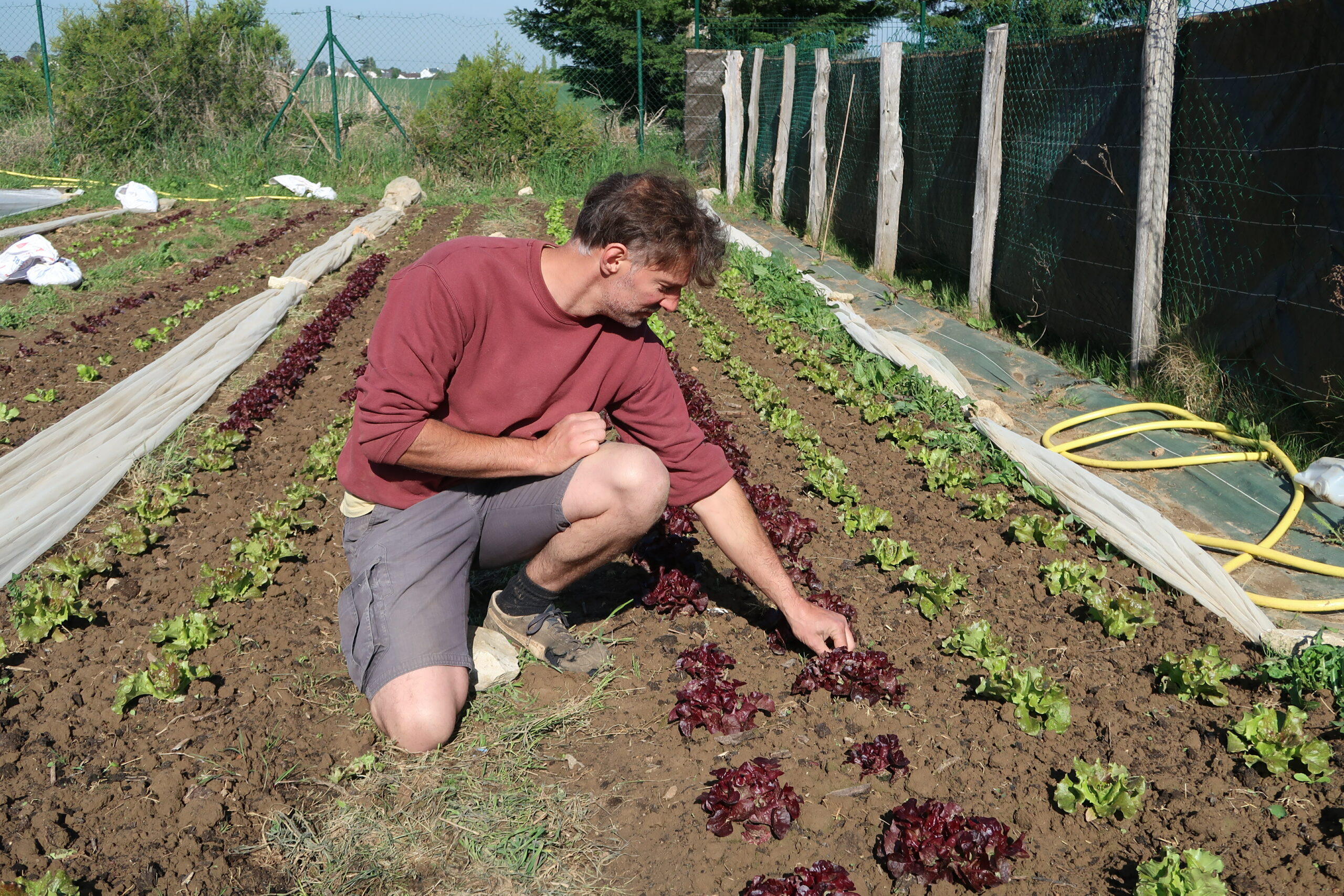 Pierre Lalance a le sourire. Dans son champ de Crespières, il bichonne ses salades, ses épinards et autres légumes. Après avoir arrosé et retiré les mauvaises herbes, il file sous sa serre pour s’assurer que ses semis sortent de terre.