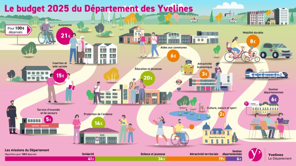 Pour 2025, le budget des Yvelines s’élève à 1,6 milliard d’euros dont : 677 M€ pour accompagner les plus fragiles, 517 M€ pour accompagner l’enfance et la jeunesse, 279 M€ investis pour l’attractivité du territoire et 122 M€ pour optimiser la gestion départementale.