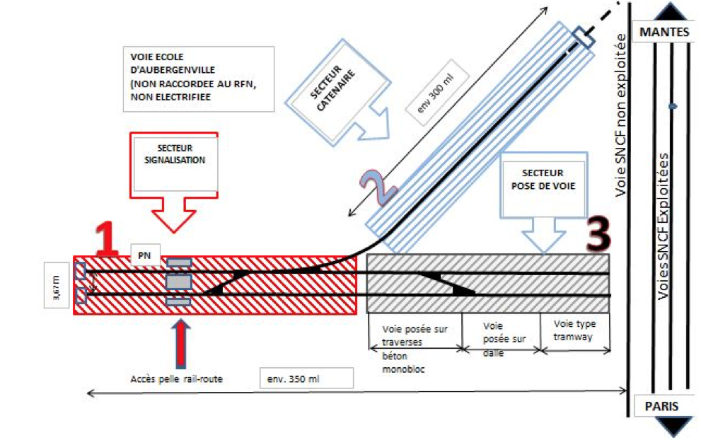 - Un espace dédié à la sécurité et aux métiers agissants sur les réseaux d’alimentation en électricité et/ou de communication équipés de poteaux aériens et de caniveaux communicants avec ceux du plateau technique ferroviaire.
