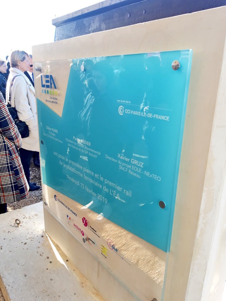 Didier Kling, Président de la CCI Paris Ile-de-France, Pierre Bédier, Président du Conseil départemental des Yvelines et du GIP ActivitY’, Xavier Gruz, Directeur du projet EOLE – NExTEO SNCF Réseau et Jacques Empinet, Président du Conseil d’établissement de L’EA, les écoles des éco-activités, ont posé vendredi 15 février 2019, la première pierre et le premier rail de la plateforme ferroviaire de L’ÉA-ITEDEC à Aubergenville. Ce projet unique en France de 2,8M€ formera entre 2019 et 2021, près de 300 apprentis et stagiaires aux métiers du ferroviaire.