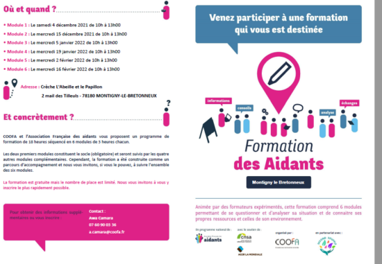 Plusieurs ateliers de formation pour les aidants vont avoir lieu prochainement à Montigny-le-Bretonneux à la crèche L’Abeille et le Papillon (2 mail des Tilleuls) :