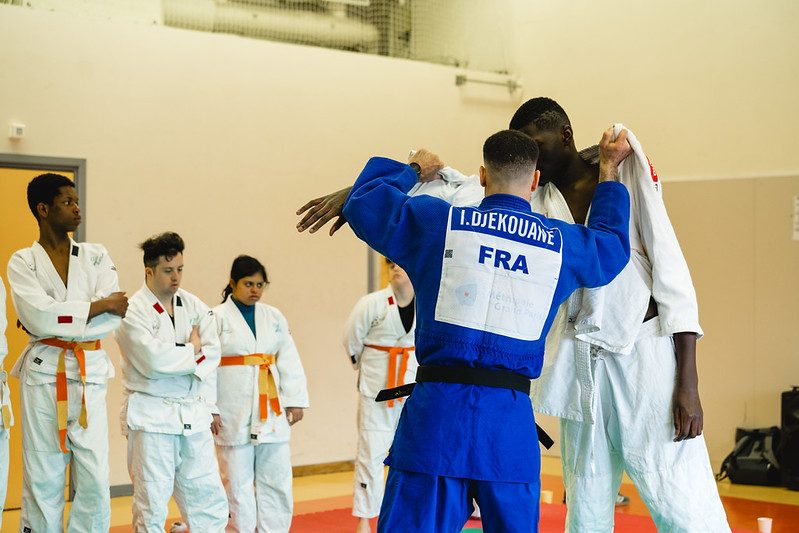 Comme tous les lundis, des adolescents, filles et garçons accompagnés à l’IME de Sartrouville, arborent fièrement leur kimono floqué du logo du COS Judo. Ils nouent avec application leur ceinture blanche, jaune ou orange, selon leur niveau. Ils montent sur le tatami, saluent Idir Djekouane, le professeur de judo adapté, en inclinant la tête comme l’exige le code international du judo. La séance commence. Certains, impatients, sautillent sur place, d’autres regardent ailleurs. Idir demande aux jeunes judokas le nom des prises et techniques apprises. En japonais comme il se doit ! O Soto Gari, O Uchi Gari, Uchi Mata, Kumi Kata… au milieu des rires, les noms jaillissent, un peu écorchés mais quand même « presque ça ».