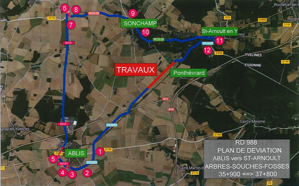 La première phase débutera le 25 octobre pour une durée maximale de quatre mois. Ils nécessiteront des travaux d’abattage et de dessouchage. La route sera fermée de jour comme de nuit, durant les vacances scolaires de la Toussaint (5 à 6 jours ouvrés entre le lundi 25/10 et le vendredi 05/11). Un itinéraire de déviation sera prévu via la Nationale 10 et Sonchamp (RD176 et RD936). Ensuite, des travaux de préparation des sols, de replantation et de finition seront réalisés par demi-chaussée sous circulation alternée jusqu’à la fin du chantier.