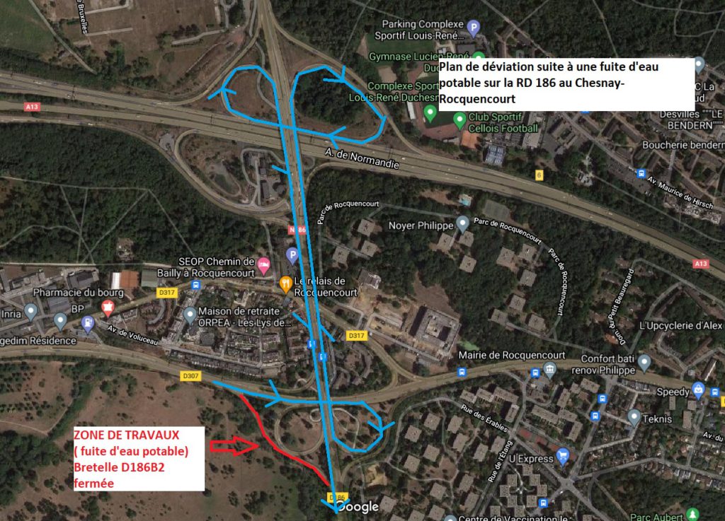 Suite à une fuite d’eau conséquente sur la chaussée, la circulation est interrompue sur la bretelle reliant la RD307 depuis Saint-Nom-la-Bretèche à la RD186 en direction de Versailles sur la commune du Chesnay-Rocquencourt. Les travaux de réparations seront engagés par le Syndicat des Eaux de l’Ouest Parisien (SEOP) le 20 août, la réouverture du tronçon devrait avoir lieu à la fin août.
