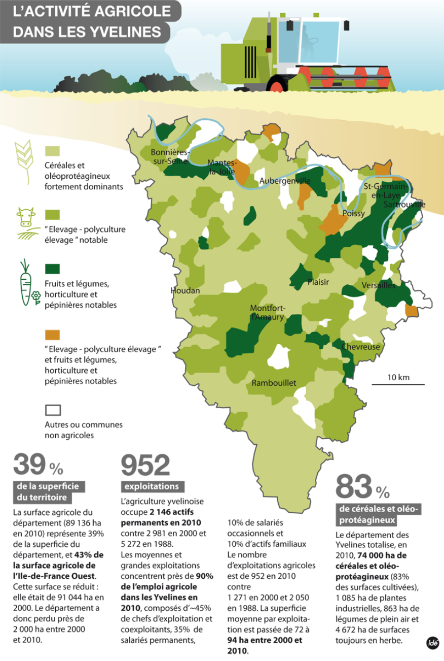 ce qui fait du territoire yvelinois, le 2e département agricole d’Ile-de-France après la Seine-et-Marne. Si la plupart des agriculteurs sont céréaliers, on trouve également dans les Yvelines des maraîchers, des arboriculteurs, des éleveurs et des exploitants de la filière laitière.