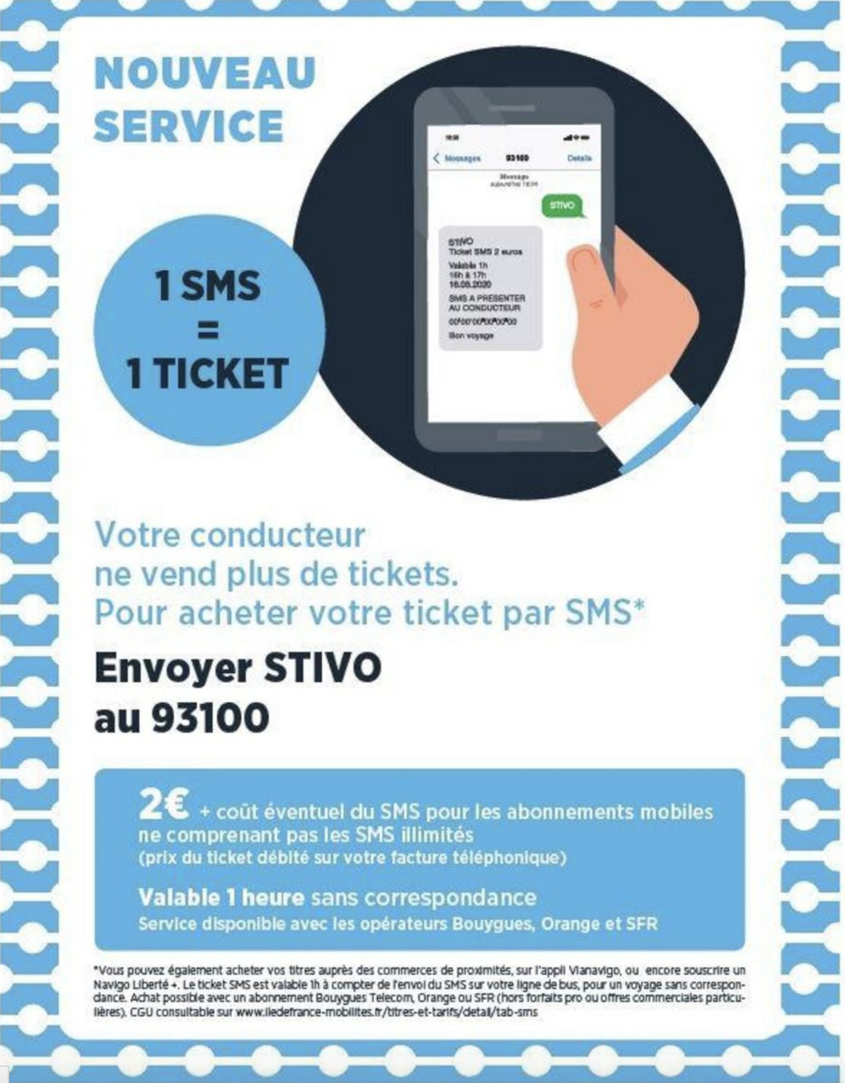 Le ticket SMS est généralisé aux bus d’Île-de-France. Il suffit d’envoyer un simple SMS pour obtenir son ticket : plus besoin d’échanger de ticket ni de monnaie avec le conducteur. Le système a déjà fait ses preuves sur quelques réseaux depuis un an. Les usagers envoient un SMS au numéro de téléphone 93100 pour les bus en moyenne et grande couronne et au 93800 pour les bus RATP à Paris et en Petite couronne. Ce SMS doit être composé du code correspondant au numéro de la ligne de bus empruntée (par exemple 29 pour la ligne 29 de la RATP). Le ticket est valable une heure sans correspondance et le conducteur peut vous demander de voir votre écran de smartphone pour vérifier. Les 2 euros sont ensuite prélevés directement sur la facture de téléphone de l’usager