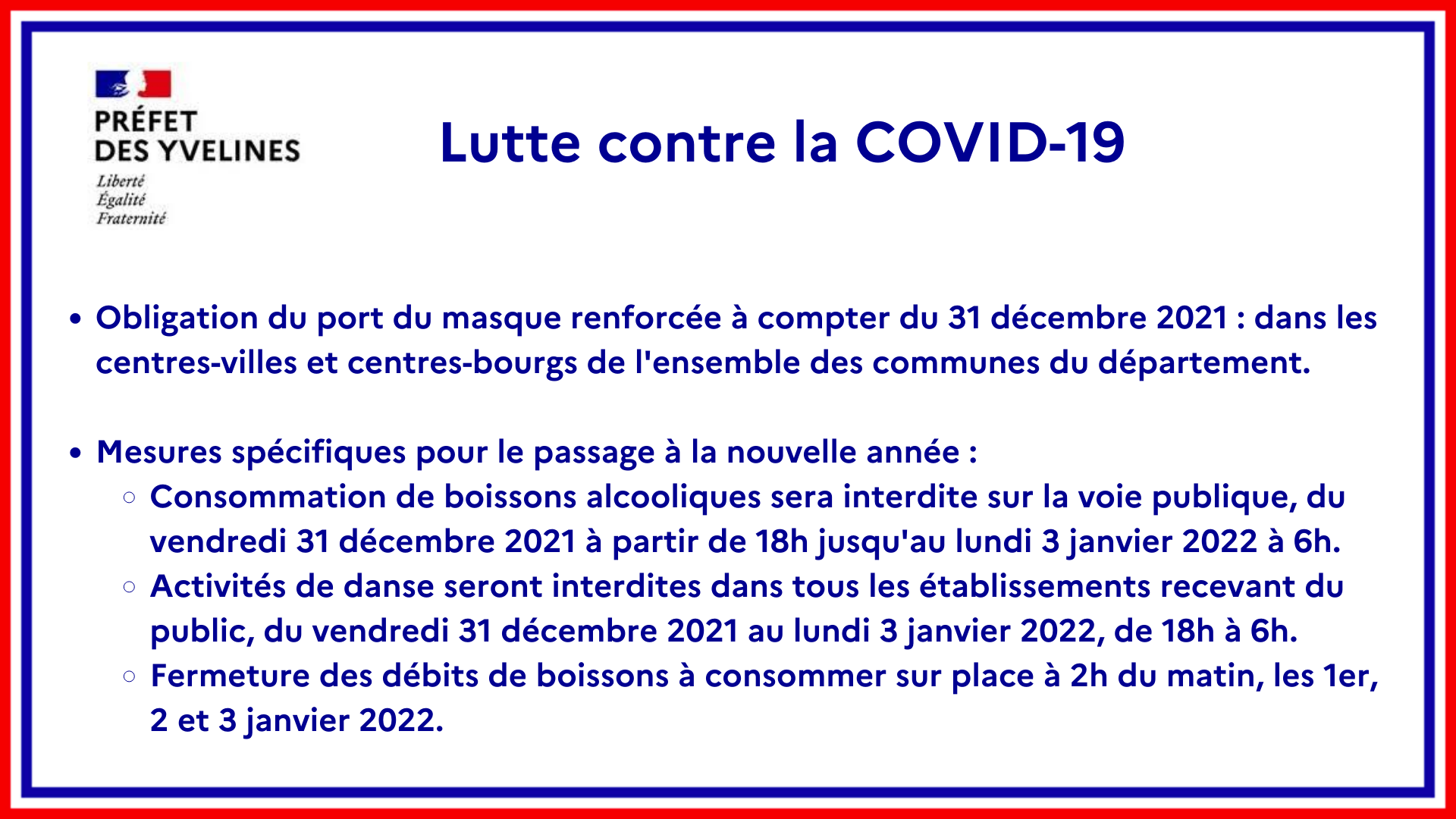 Le Préfet des Yvelines a également renforcé l’obligation de port du masque et pris des mesures spécifiques pour le passage à la nouvelle année :