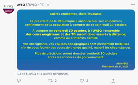 Les cours à l’université et dans les établissements du supérieur doivent être assurés à distance. Les bibliothèques universitaires seront ouvertes sur rendez-vous et dans le respect d’une jauge. Les restaurants universitaires restent ouverts mais seulement pour les repas à emporter.