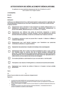 - L’attestation de déplacement dérogatoire (comme au printemps : pour faire ses courses, aller chez le médecin ou s’aérer autour de son domicile) ;