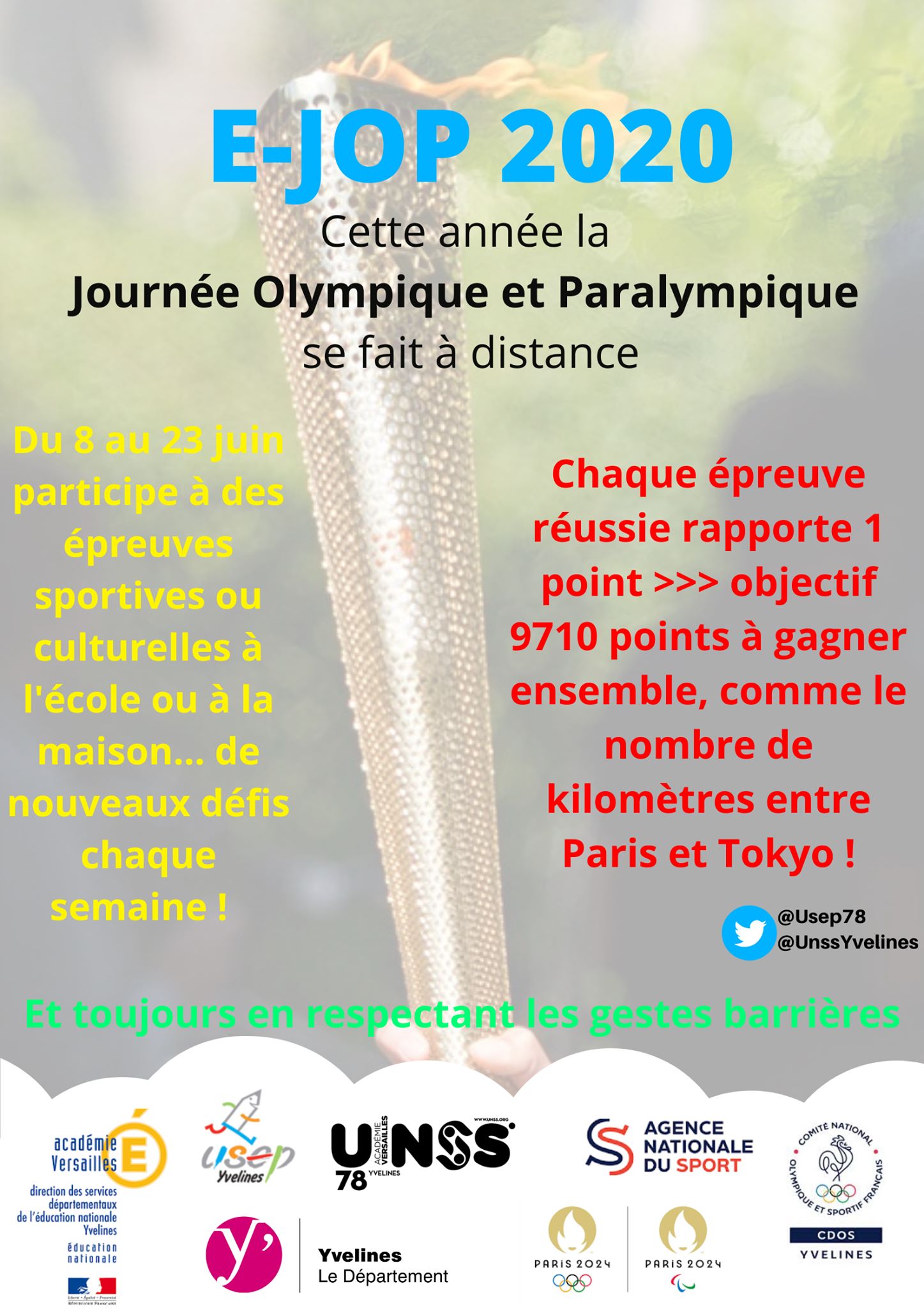 Sous l’impulsion de l’UNSS 78 (Union Nationale du Sport Scolaire des Yvelines), de l’USEP (l’Union Sportive de l’Enseignement du Premier Degré) et de la DSDEN 78 (direction des services départementaux de l’éducation nationale) qui organisent toute l’année des activités sportives pour les jeunes, une e-JOP sera organisée. Il s’agira de la première Journée Olympique et Paralympique à distance.