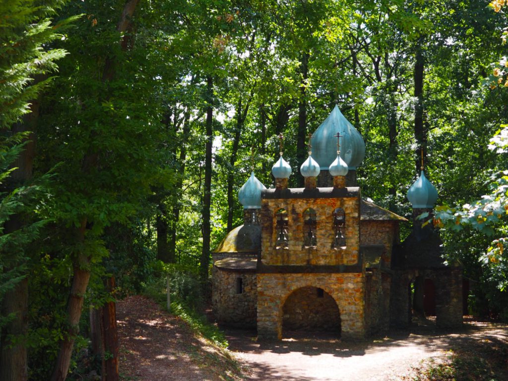À seulement 2 kilomètres de la route nationale, nous nous retrouvons dans le calme d’une zone pavillonnaire. Le bois du Fay entoure les maisons. Puis soudain, un grand portail orné de dômes typiques des édifices religieux orthodoxes. Construit dans la tradition Byzantine, on devine, au loin, le Skit.