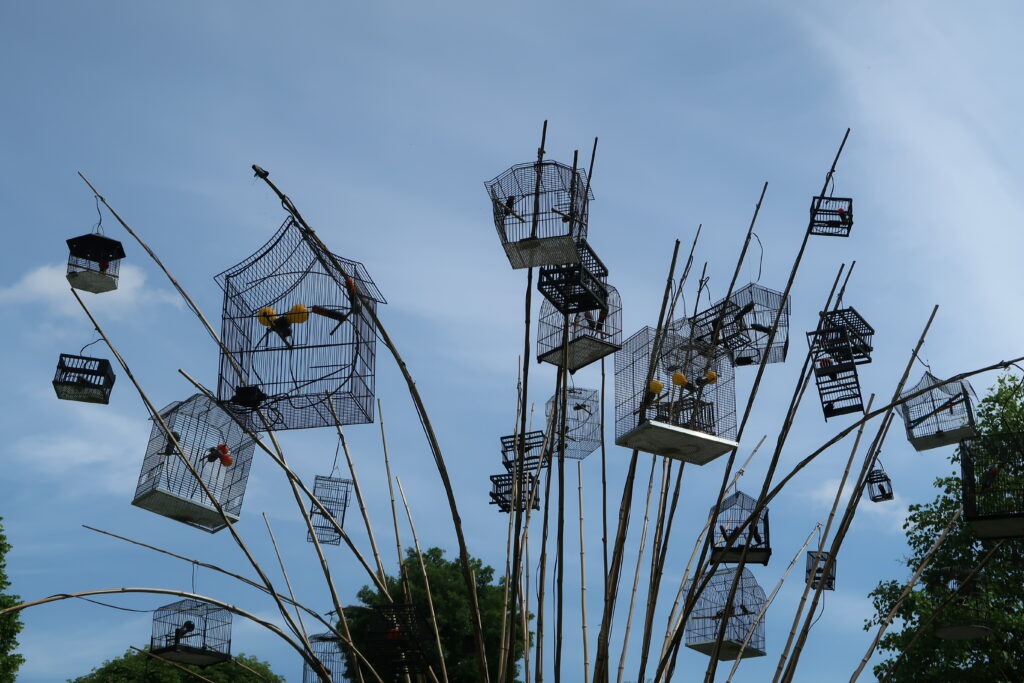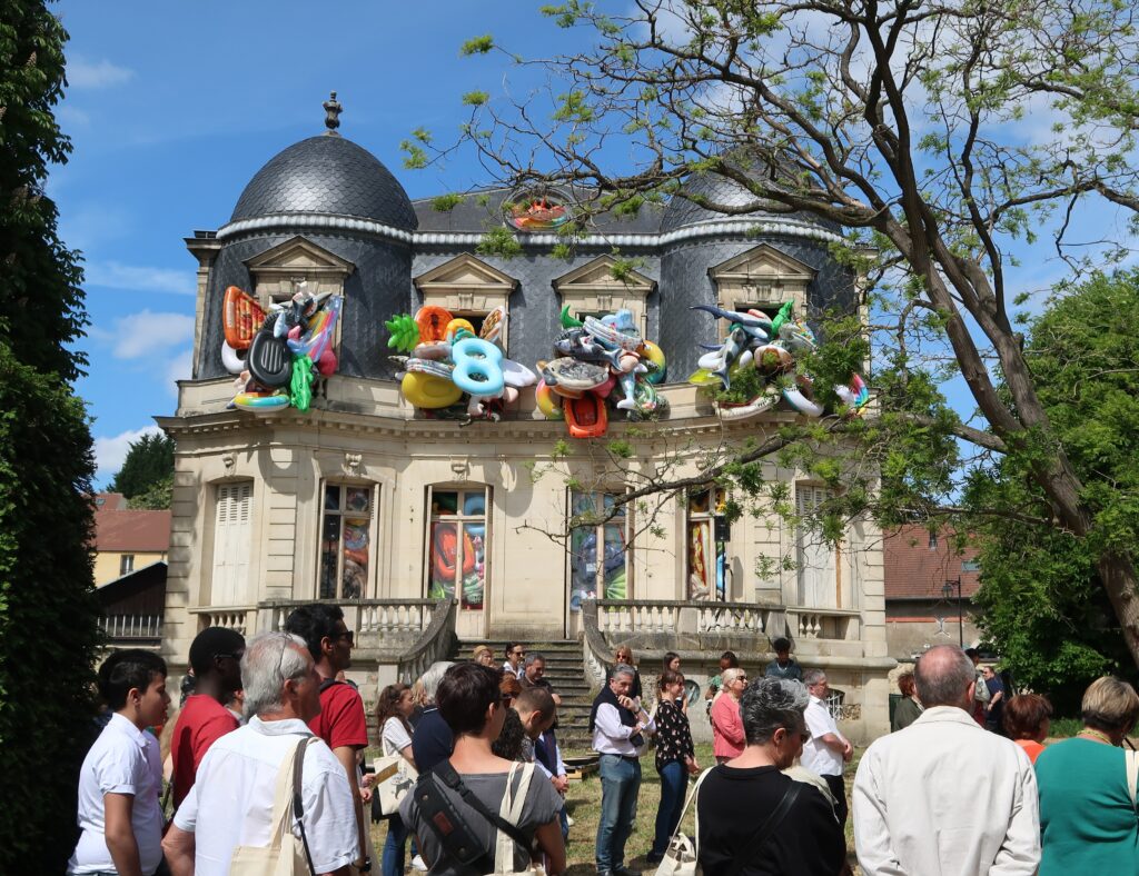 Des œuvres étonnantes, réalisée Laurent Perbos l’invité d’honneur de cette 25 é édition, interpellent. Des jeux gonflables débordent des fenêtres l’ancienne demeure et des palmiers confectionnés avec des frites de natation ont été érigés devant l’équipement. L’objectif est de questionner le regard du spectateur. Juste à côté devant la mairie, les cages aux oiseaux, fixées sur des bambous, sont tout aussi surprenantes.