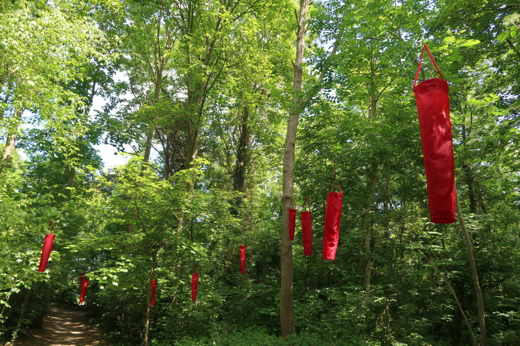 Plus loin, on découvre plusieurs éléments imposants réalisés en métal. Juste après en levant la tête, voici des manches à air rouges qui invitent à la rêverie et à la contemplation. Après avoir été transporté, les promeneurs tombent nez à nez avec des troncs d’arbres enveloppés de fil rouge. Des petits mots y sont accrochés. L’arbre devient alors un livre ouvert…