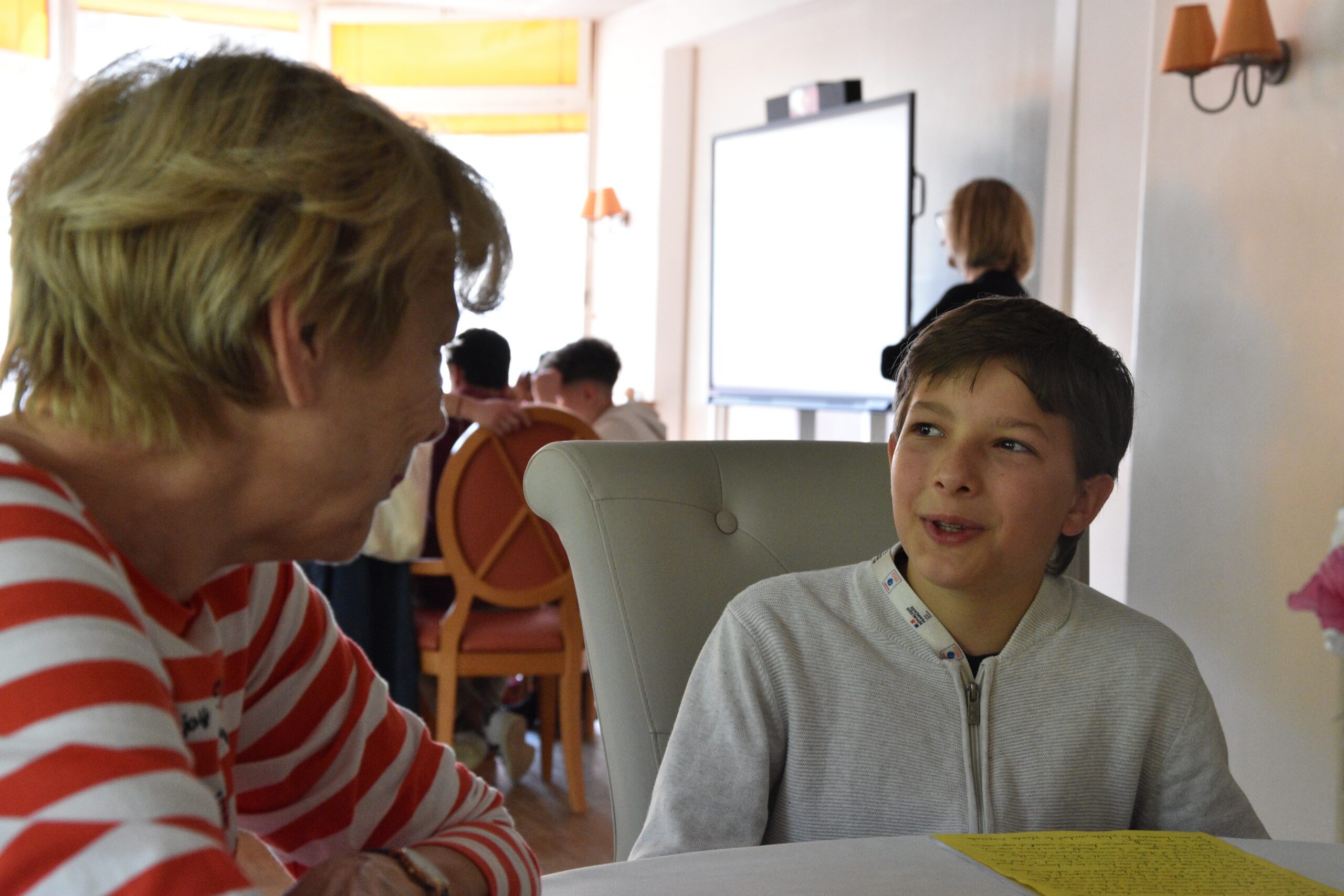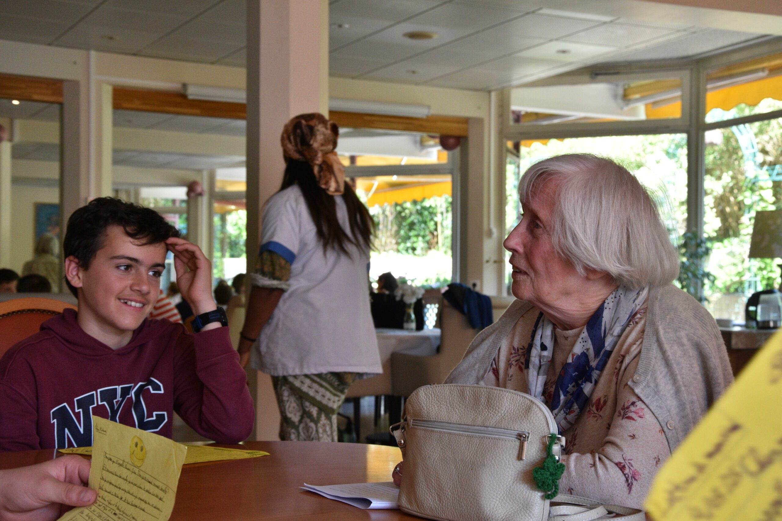Il est vrai que Christiane, habituée de la résidence autonomie Jean Laurent au Vésinet, a la parole facile mais son public est captivé. Les cinq garçons du collège Le Cèdre, situé à quelque pas de la résidence, ne perdent pas une miette de l’anecdote qui leur est contée. « Je ne regarde jamais la télé, si bien que celle que j’avais, je l’ai donnée. En revanche j’utilise mon portable pour faire des recherches sur internet » détaille l’aînée de la table. Pour ses jeunes interlocuteurs, la vie sans télé semble pratiquement impossible mais ils sont rassurés de voir que leur hôte manie presque aussi bien qu’eux son smartphone. Cette anecdote témoigne combien il est facile de créer du lien entre les générations. Une réussite que l’on doit aux échanges judicieux menés par la Direction de l’éducation et de la jeunesse du Département des Yvelines avec l’association « 1 Lettre 1 Sourire », le tout soutenu par l’agence AutonomY’.