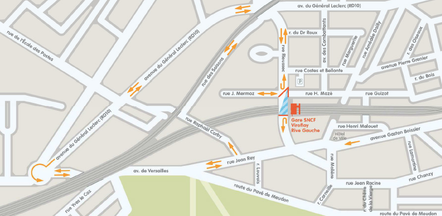 Nous vous informons que dans le cadre de la construction de la station souterraine Viroflay-Rive Gauche, les entreprises de travaux vont procéder au démontage du pont provisoire, à la construction de la voirie provisoire aux abords de la place Koenig ainsi qu’à des interventions sur le réseau ERDF pendant la première semaine des vacances scolaires de la Toussaint. Ces travaux vont nécessiter la fermeture de la rue Rieussec à la circulation automobile au niveau du pont provisoire, ainsi que le trottoir reliant la rue Hippolyte Mazé à la rue Rieussec.