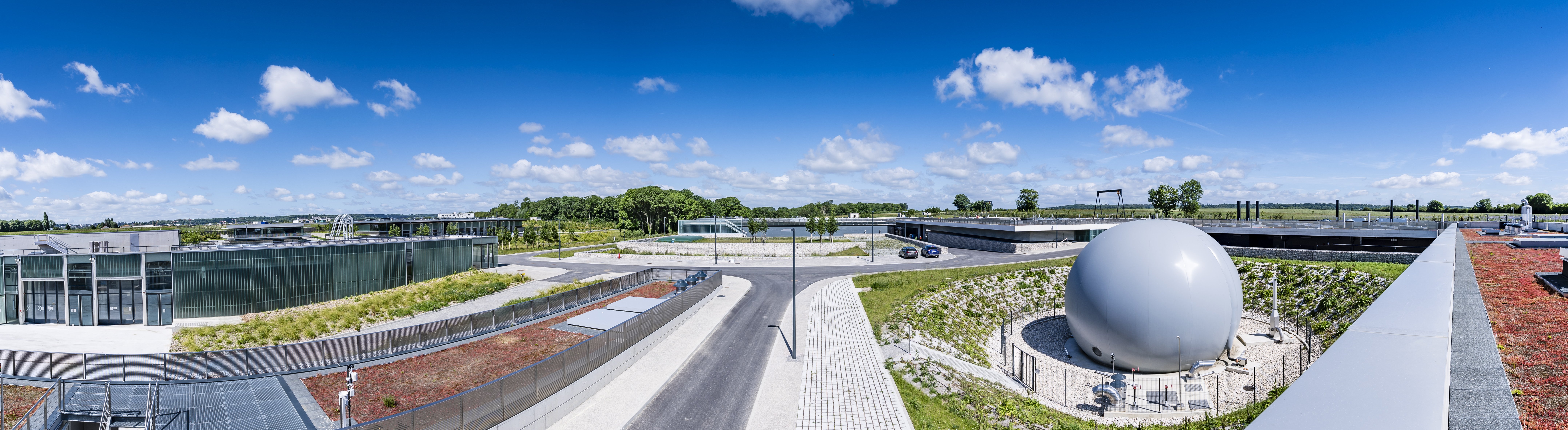 Usine d’épuration Carré de Réunion basée à Saint-Cyr l’Ecole (la bulle grise permet de stocker le biogaz) © Sevesc / Antoine Meyssonnier