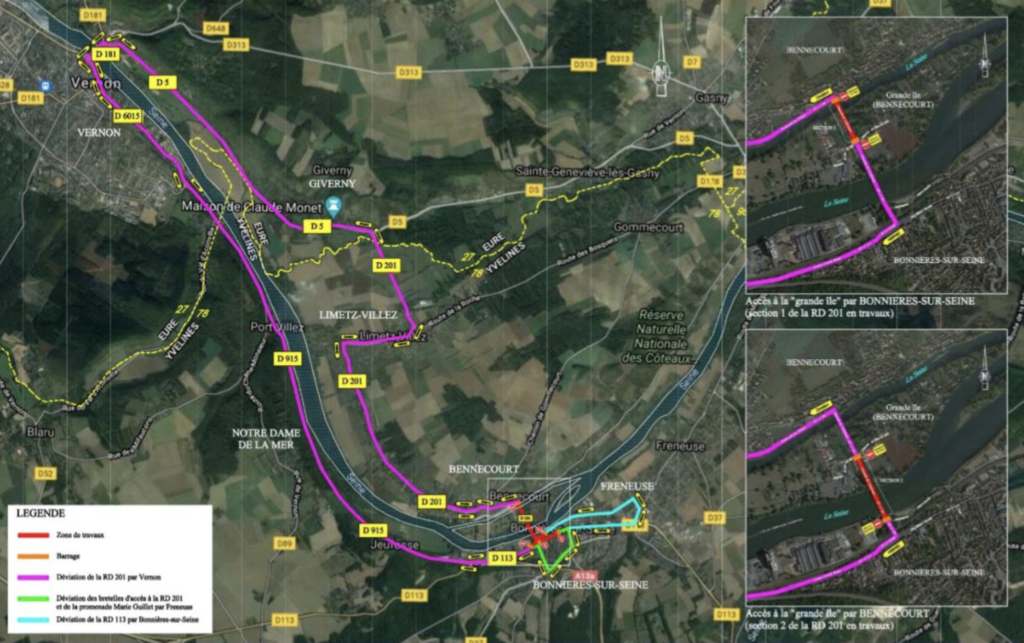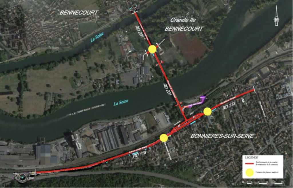 Les travaux seront réalisés successivement sur la RD 113 et l’ouvrage de franchissement de la voie ferrée par la RD 201 à partir de juillet puis sur les ouvrages de franchissement de la Seine par la RD 201 sur Bennecourt.