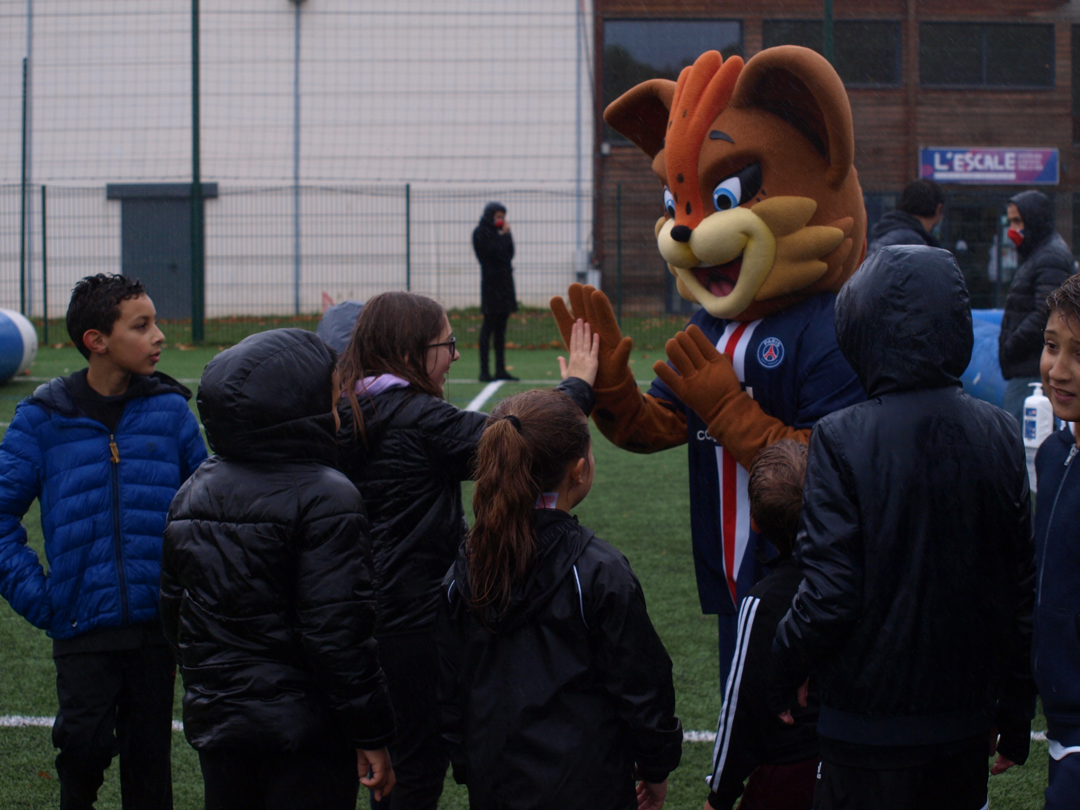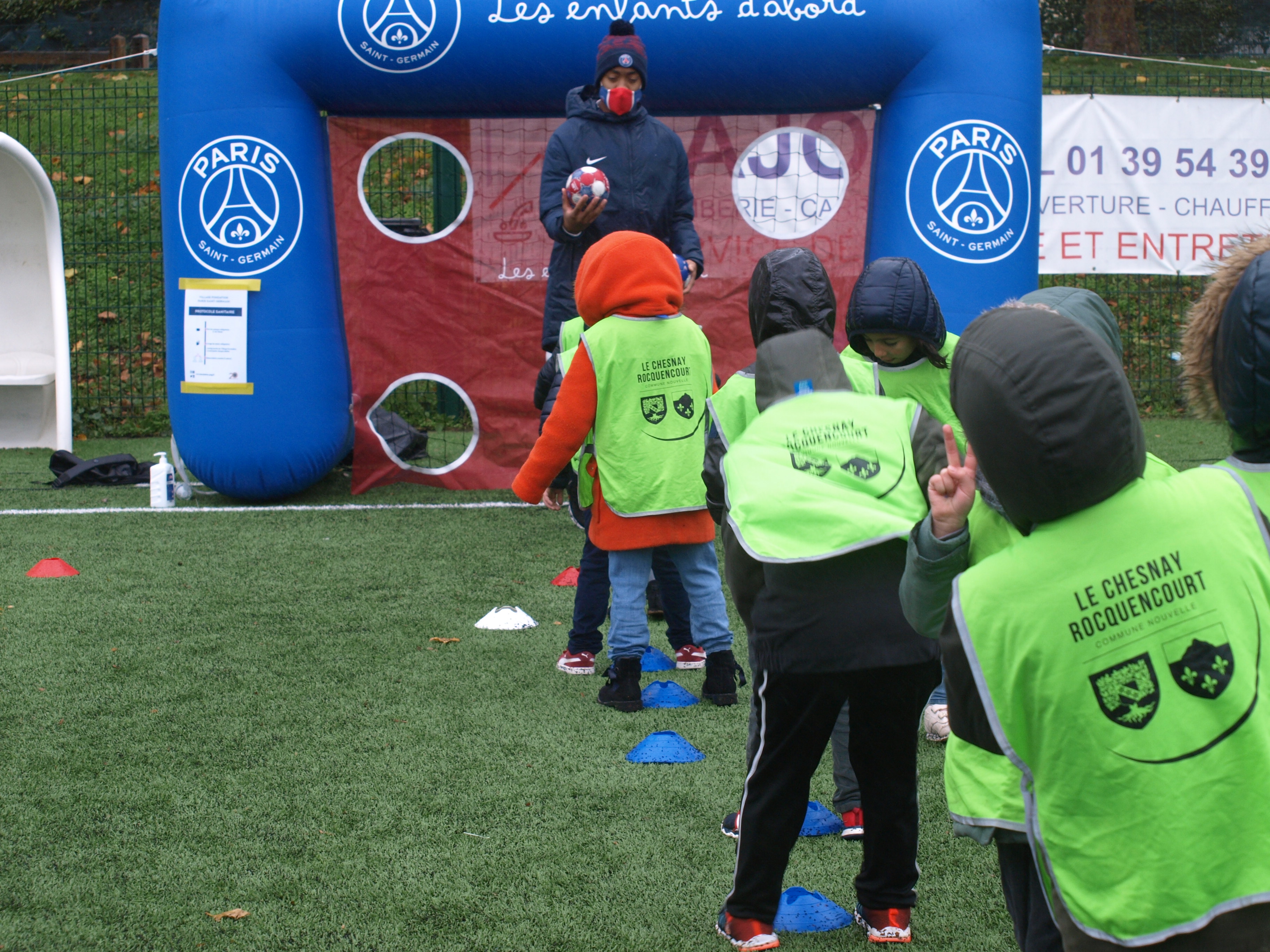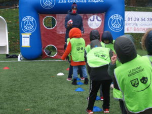 Il faisait un temps de fin d’automne sur le terrain de football du Chesnay-Rocquencourt mardi 27 octobre. Du vent, du froid et de la pluie en continue balayaient le stade. Pourtant, ils étaient plus d’une centaine d’enfants à courir dans tous les sens. Et si les parents été congelés sur le bord de la pelouse, eux se précipitaient sur tous les ateliers mis en place par la Fondation PSG et le Département des Yvelines.