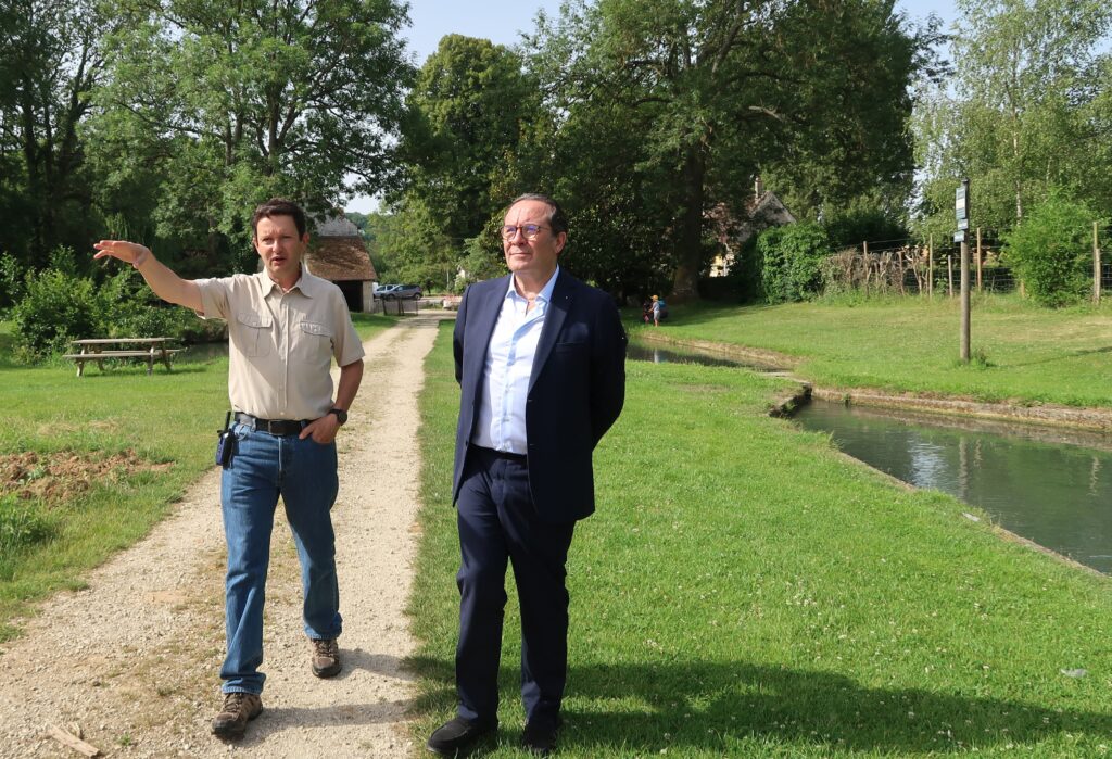 Pierre Bédier, le président du conseil départemental des Yvelines (à droite), a découvert la ferme, guidé par Emmanuel Coupin, le propriétaire de la pisciculture. CD78/Y.Fossey