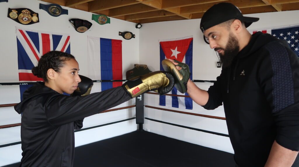 Tous les ingrédients sont réunis dans ce lieu dédié à cet art. La boxeuse est immergée dans l’atmosphère de la discipline : trois sacs de sable, un ring, des drapeaux, un chronomètre utilisé pour mesurer la durée des rounds. Il y a même de nombreux trophées accrochés au mur…