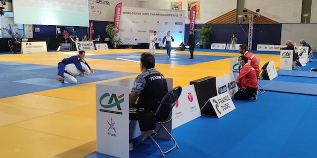 En tribune, les encouragements sont là. Pourtant, sur le tatami, les athlètes ne semblent pas perturbés. Ils regardent frénétiquement leurs entraîneurs qui multiplient les signes. Dans le gymnase Montbauron à Versailles, ce sont pourtant des combats à enjeux. Ceux pour devenir champion du monde sourd de judo.