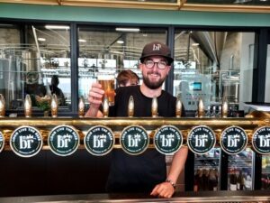 Pierre sert une bière brassée sur place à la Ménagerie du Roi, brasserie et brewpub à Saint-Cyr-l’Ecole © J. Bencivengo / CD78