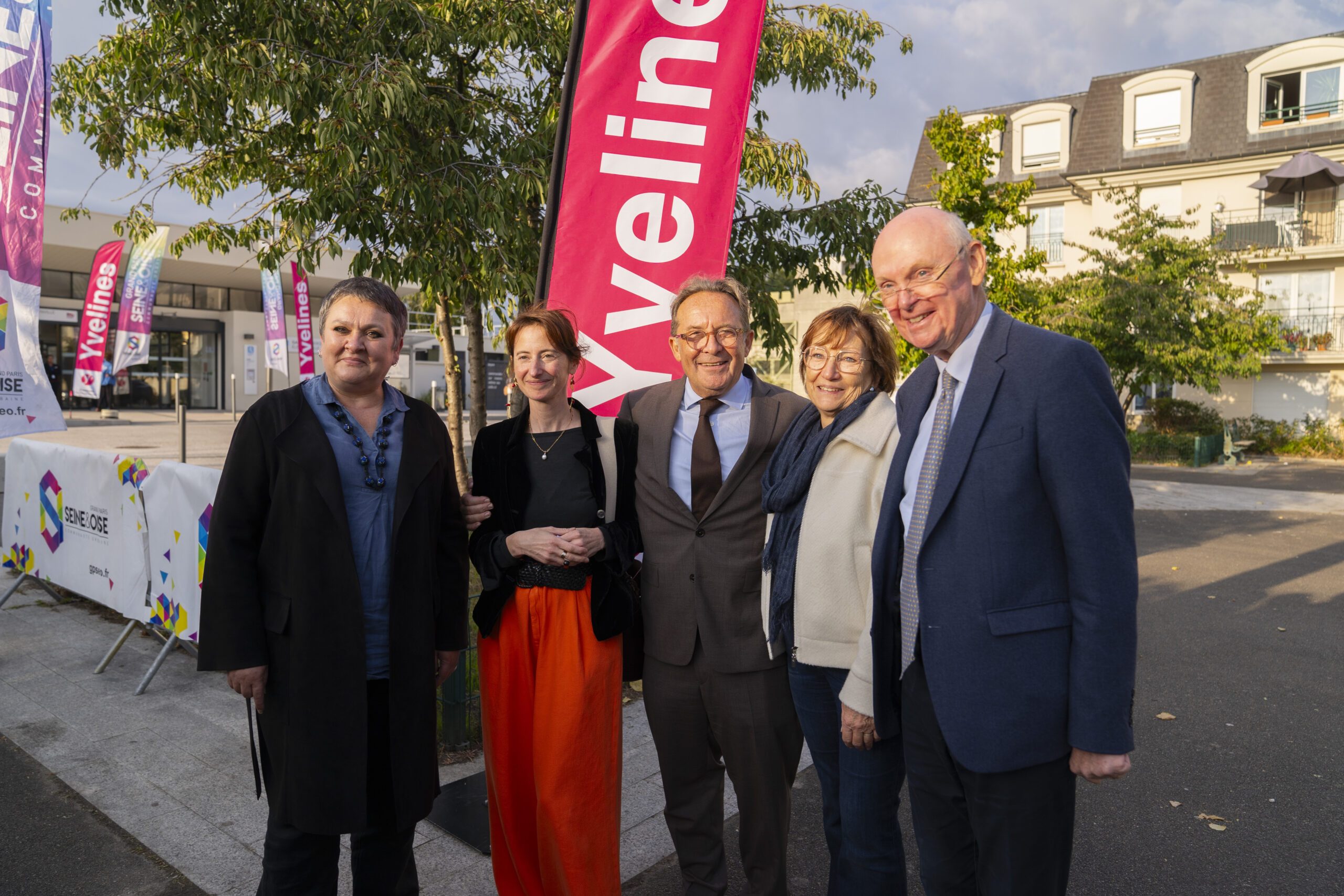 Pierre Bédier (président du Département des Yvelines), Patrick Stefanini (Région Ile-de-France Mobilités et conseiller départemental), Cécile Zammit-Popescu (présidente de GPSEO), Pauline Winocourt Lefevre (conseillère départementale du canton d’Aubergenville) et Suzanne Jaunet (conseillère départementale); ©CD78/S. Furrer