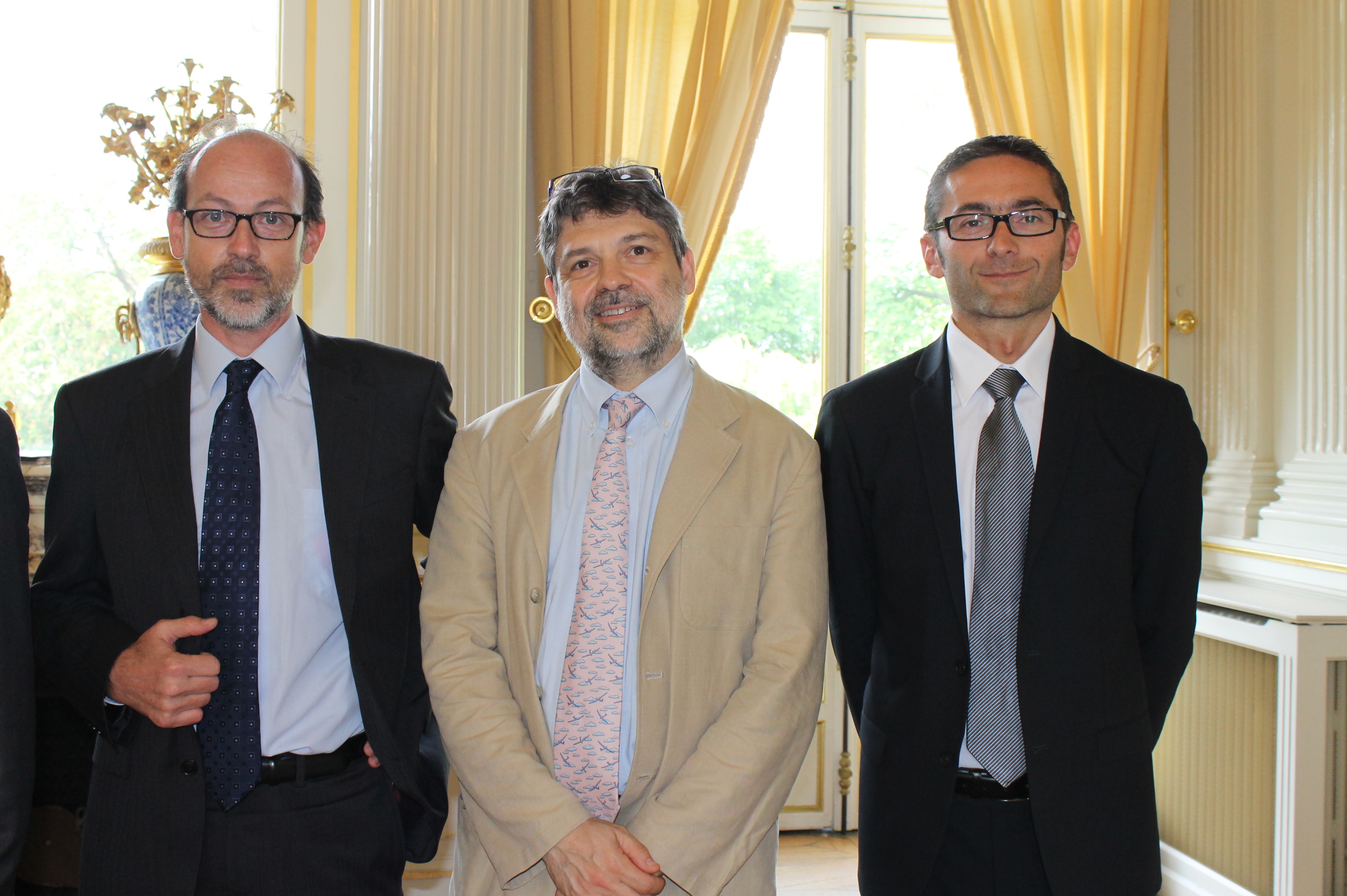 Le président du comité des Yvelines de la Ligue contre le cancer, Didier Mayeur, entouré des lauréats 2012 Jean Soulier, Prix Yvelines (à gauche) et Stéphane Germain, Prix du Conseil général (à droite),