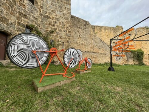 Des roues de vélo et des bicyclettes deviennent support littéraire. Un défi façon « cadavre exquis » est à relever (Inventé par les surréalistes, le cadavre exquis est un jeu collectif ; chaque participant écrit à tour de rôle une partie d’une phrase, dans l’ordre sujet–verbe–complément, sans savoir ce que le précédent a écrit).