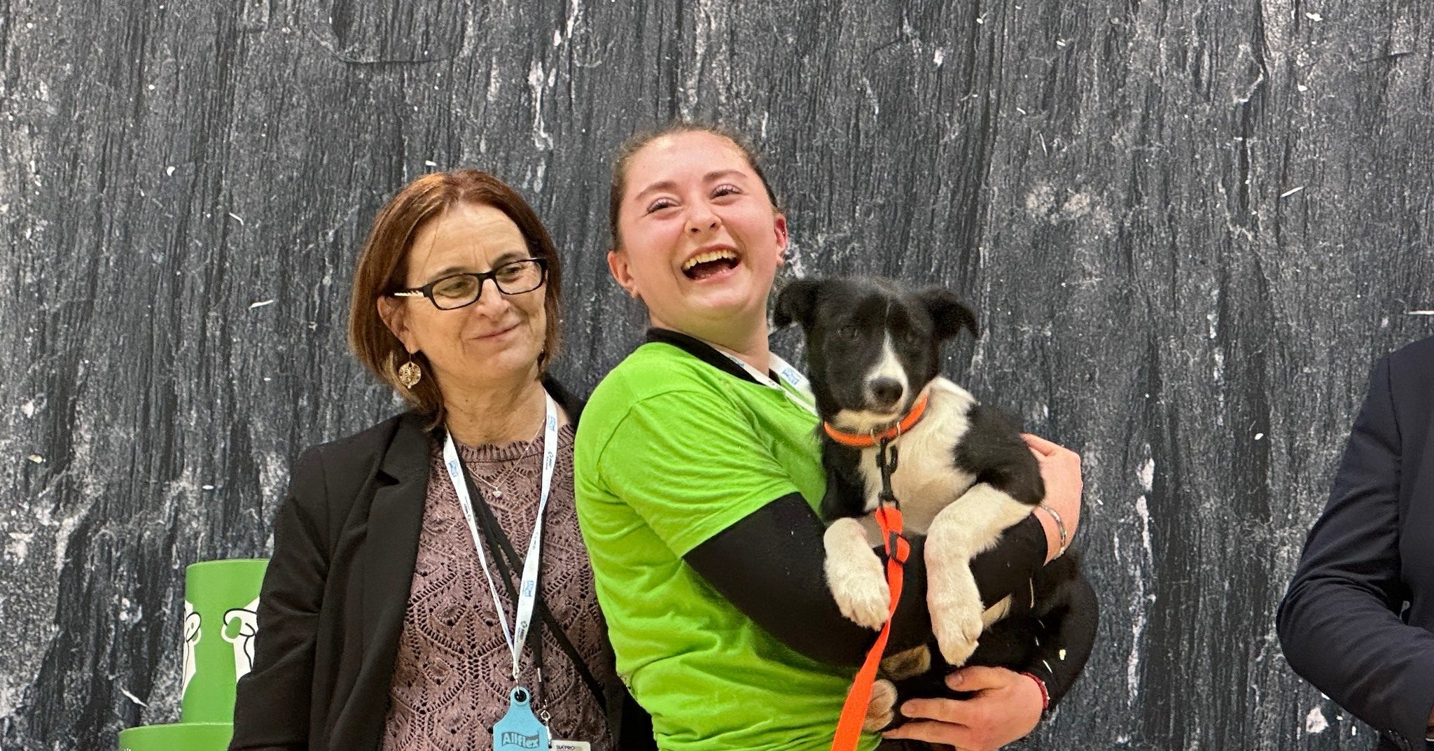 Jeanne porte un jeune border collie, récompense de sa victoire. ©Interbev/Inn'Ovin