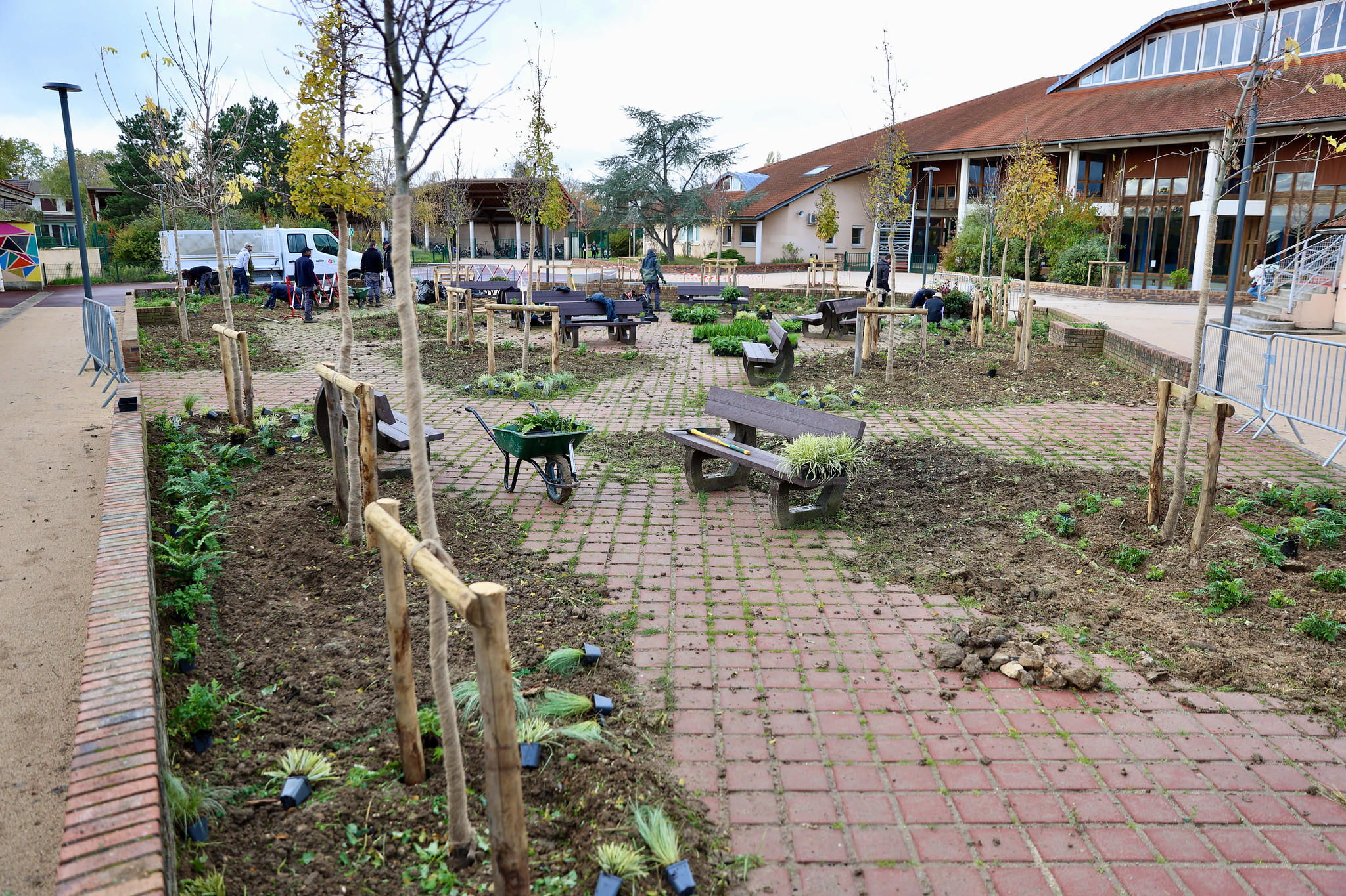 L’établissement de Conflans-Sainte-Honorine est site pilote concernant ce type d’aménagement. Les espaces extérieurs ont été massivement végétalisés, des arbres ont été plantés et les enrobés classiques de la cour de récréation ont été remplacés par des matériaux innovants. Une haie champêtre et une prairie ont même été créées.