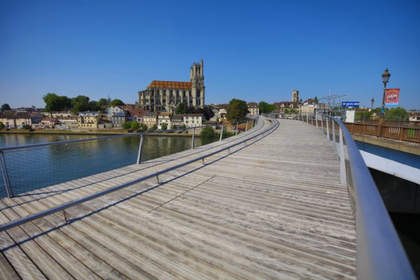 Vue de la Collégiale de Mantes-la-Jolie depuis la passerelle Mantes-la-Jolie/Limay sur l’itinéraire de « La Seine à Vélo ». franchit Photo : N.Duprey/CD78