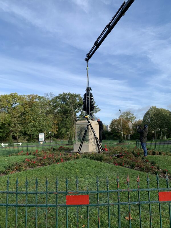 Intégralement remontée en atelier, la sculpture a ensuite été transportée entière à Maisons-Laffitte afin d’être reposée sur son socle, qui a lui aussi fait l’objet d’une restauration.