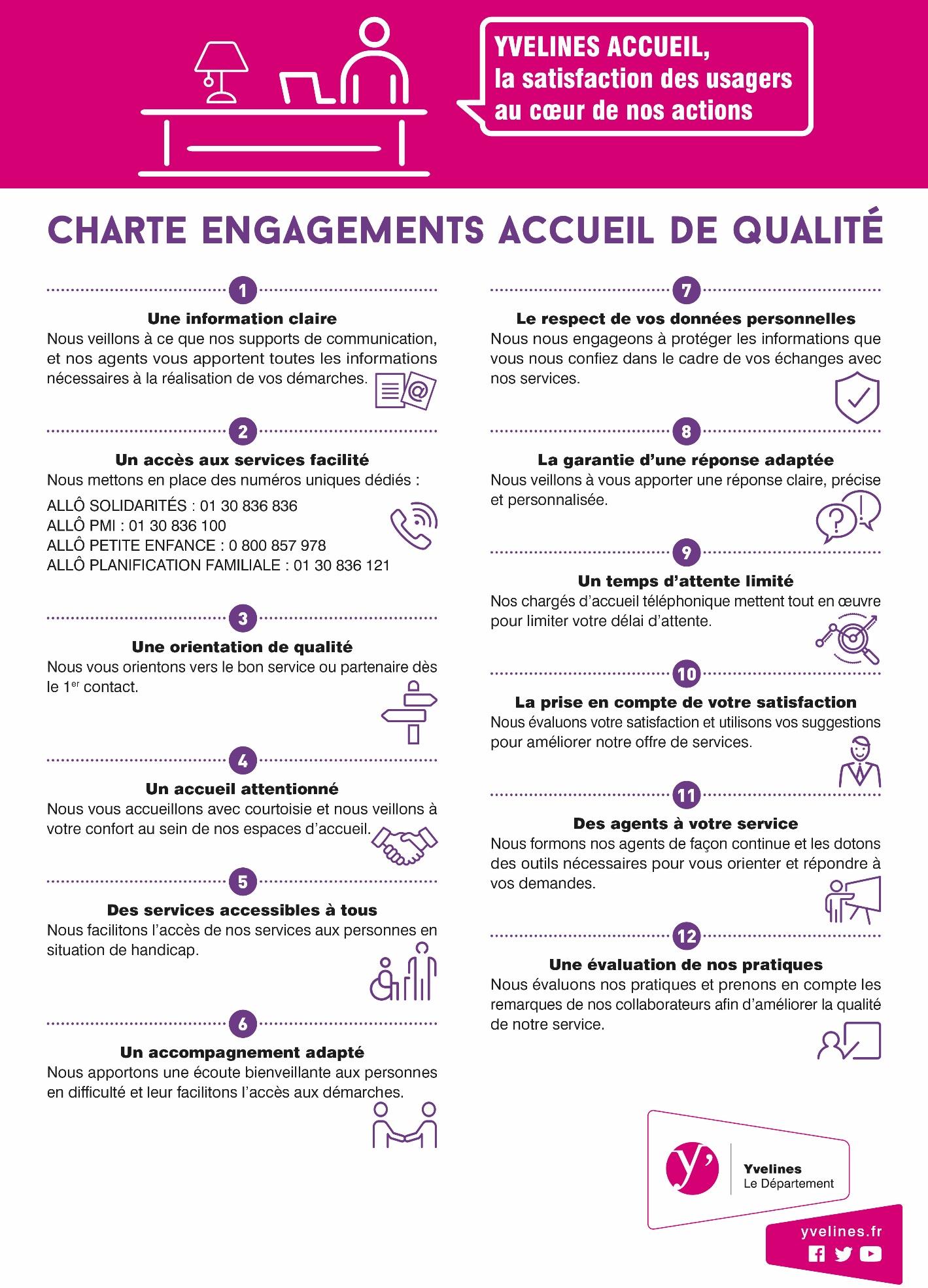 Pour aller plus loin dans l’engagement du Département auprès des yvelinois, et en attendant une labellisation « Charte Marianne », une charte de 12 engagements de qualité de service a été élaborée : courtoisie, orientation de qualité, garantie d’une réponse claire et personnalisée.