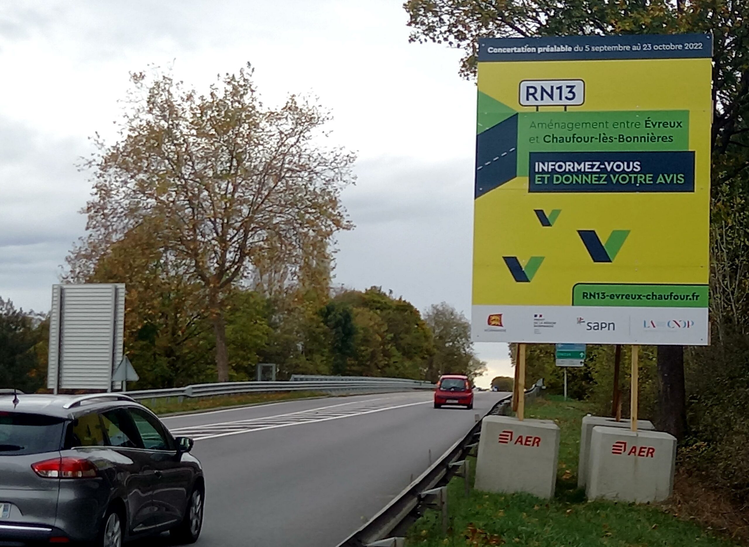 Afin de recueillir l’avis des populations autour de ce dossier, une campagne de concertation préalable a été menée du 5 septembre au 23 octobre 2022. Dans le but d’informer les riverains et les usagers, d’immenses panneaux ont été posés à cet effet en bordure de la RN 13 à l’entrée des Yvelines.