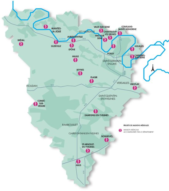 Suite à l’appel à projets de « maisons médicales » lancé en 2017 par le Département, 23 candidatures ont été déposées. Le comité de sélection, composé de 6 élus, de représentants de l’ARS et des services de l’Etat, a retenu les projets de communes rurales et urbaines : Ablis, Aubergenville, Beynes, Bonnelles, Bréval, Carrières-sur-Seine, Chanteloup-les-Vignes, Condé-sur-Vesgre, Conflans-Sainte-Honorine, Dampierre-en-Yvelines, Epône, Guerville, Mantes-la-Jolie, Maule, Plaisir, Poissy, Saint-Arnoult-en-Yvelines, Triel-sur-Seine, Vaux-sur-Seine et Viroflay.