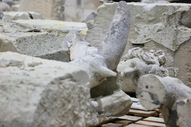 Anne-Laure Goron, conservatrice-restauratrice de sculptures, travaille actuellement sur le chantier du Réveil de la Pierre dans un hangar de l’ancien site industriel Dunlopillo à Mantes-la-Jolie. Depuis bientôt deux mois, Zéphyr et Flore, Vénus et Adonis, Céphale et Aurore, Vertumne et Pomone – les quatre groupes sculptés qui depuis quatre siècles ornent les grilles de l’orangerie du château de Versailles –, s’y offrent une remise en beauté, bien nécessaire après tant de temps passé à coucher dehors.