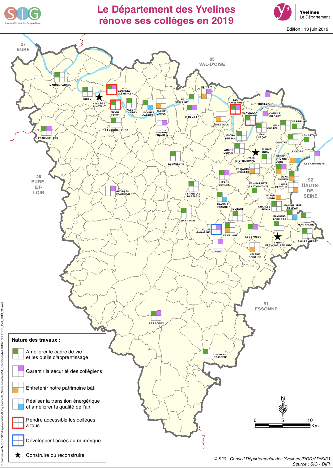 Carte des collèges des Yvelines qui vont bénéficier d’une rénovation durant l’été 2019 (cliquez pour agrandir l’image).