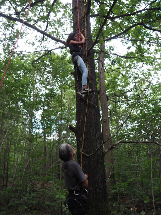 Pierre, venu partager sa passion avec les collégiens, est grimpeur. Sans rien abîmer ou dénaturer, il monte aux arbres. Une corde de sécurité, un harnais et une petite échelle. C’est le peu d’équipement nécessaire pour un voyage en terre inconnue.