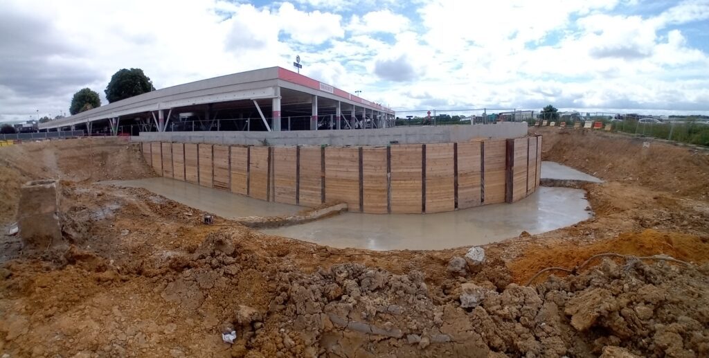 Le passage sous la voie rapide a été construit par la réalisation d’une série de pieux avant de couler une dalle en béton depuis la surface. Ensuite, les terrassements ont été réalisés en taupe sous le tablier.