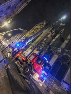 Une « Unité grimpe » a été dépêchée hier soir en urgence et s’est rendue sur place. Cette unité est composée de plusieurs pompiers de diverses casernes des Yvelines (Versailles, Poissy, Magnanville…). Cette unité se trouvait encore sur place mardi 16 avril à 12h30. Le bras élévateur des pompiers a eu une action déterminante dans la sauvegarde du beffroi Nord de la cathédrale. 35 pompiers ont été engagés aux côtés des pompiers franciliens.