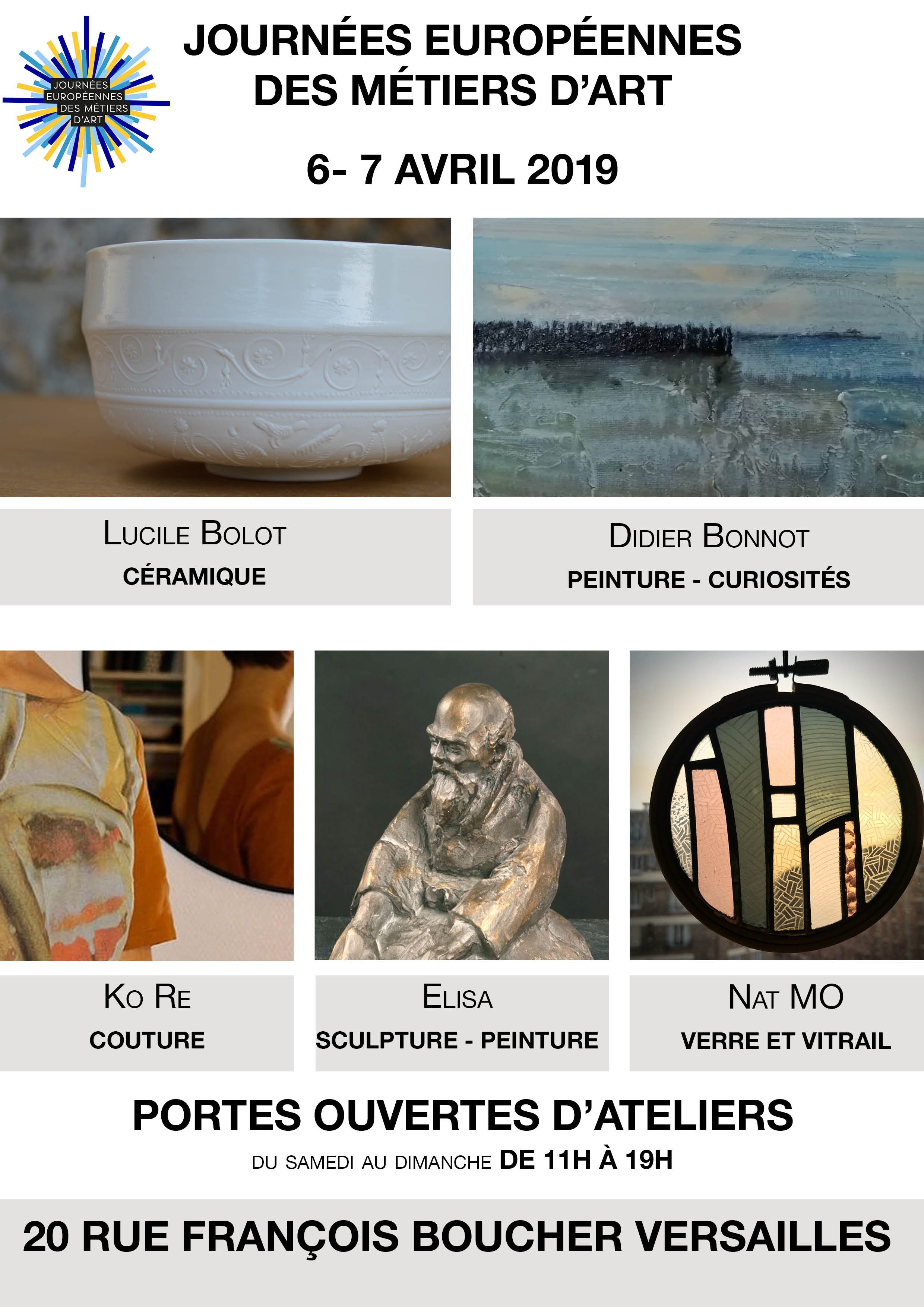 atelier Didier BONNOT 20 rue François Boucher,VersaillesDans le cadre des Journées Européennes des Métiers d'Art, (JEMA), L'atelier Didier BONNOT ouvre ses portes et propose la découverte de 5 artistes/artisans: Lucile BOLOT, Céramique Didier BONNOT, Peinture, sculpture, cabinet de curiosités Elisa, peinture, moulage KORE, création couture Nat'MO, vitrail, verre Samedi 6 et Dimanche 7 avril de 11 à 19 heures Atelier Didier […]